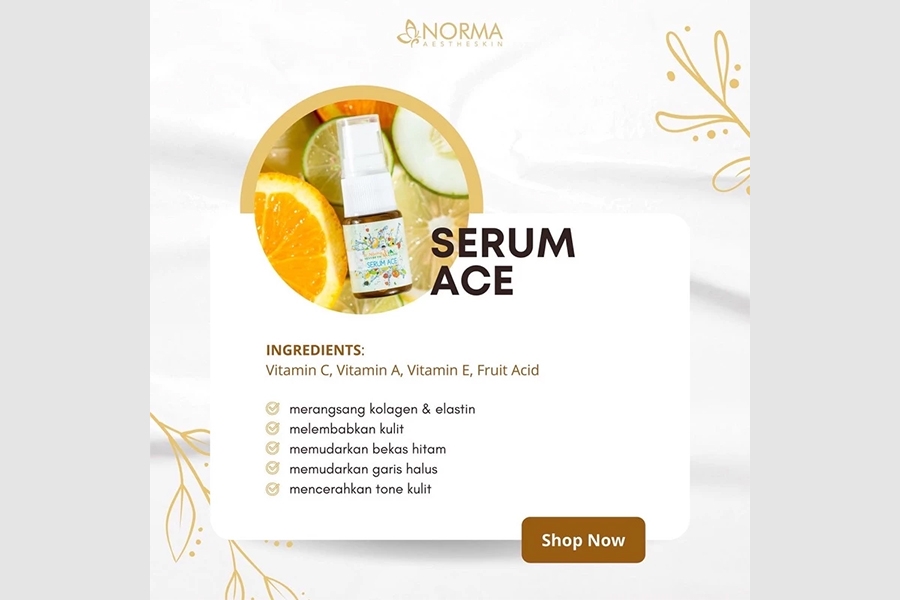 Serum yang dilengkapi dengan ascorbic acid, vitamin a, vitamin e, fruit acid yang kaya akan antioksidan, sehingga dapat melawan radikal bebas, mencerahkan dan mencegah penuaan dini pada kulit